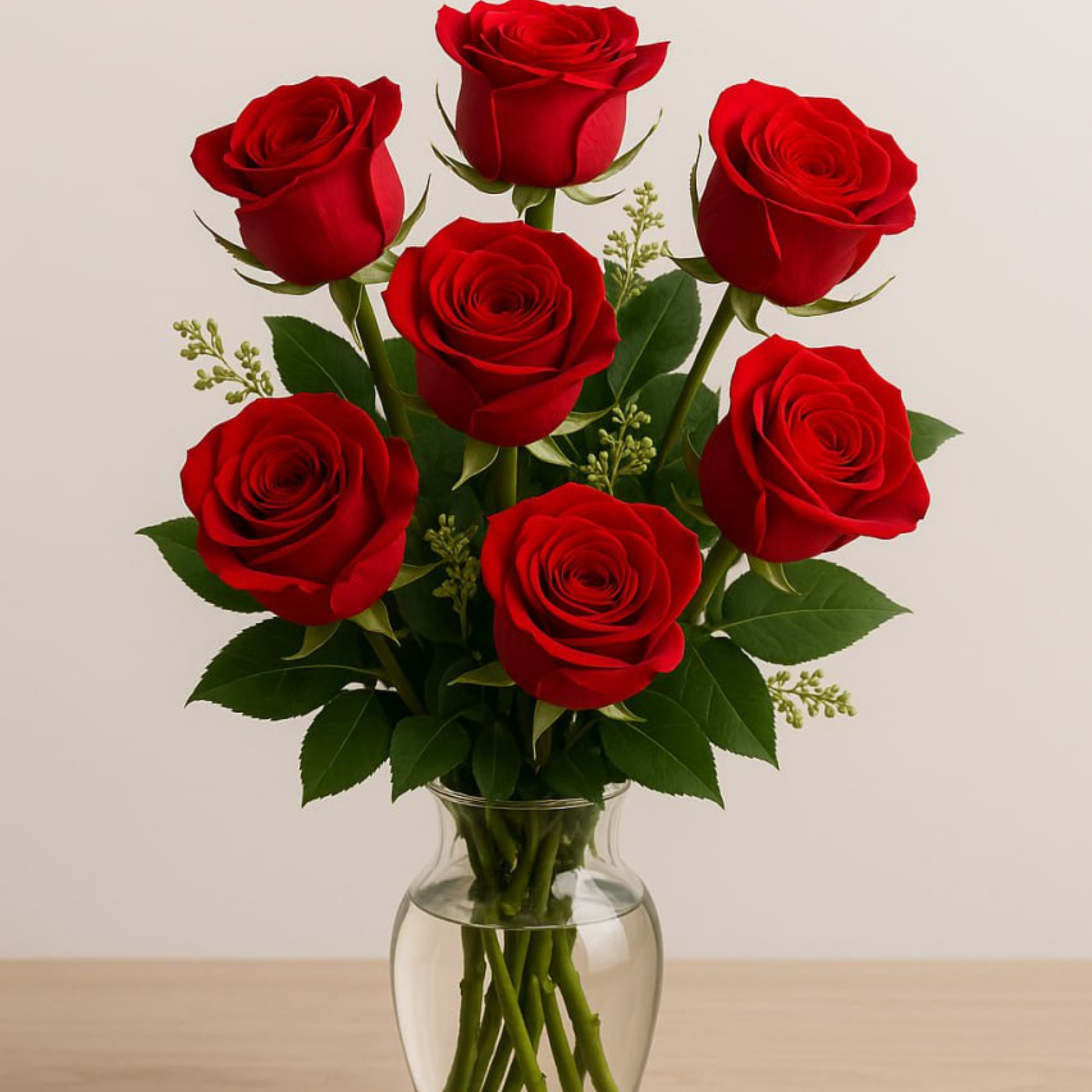 A lovely arrangement of Six classic red roses, thoughtfully placed in an elegant vase- Each bloom is